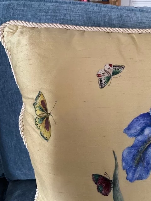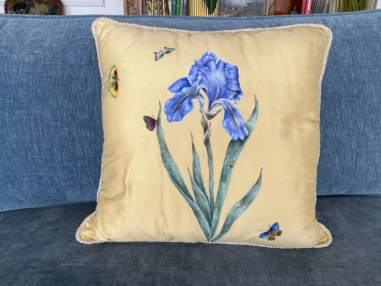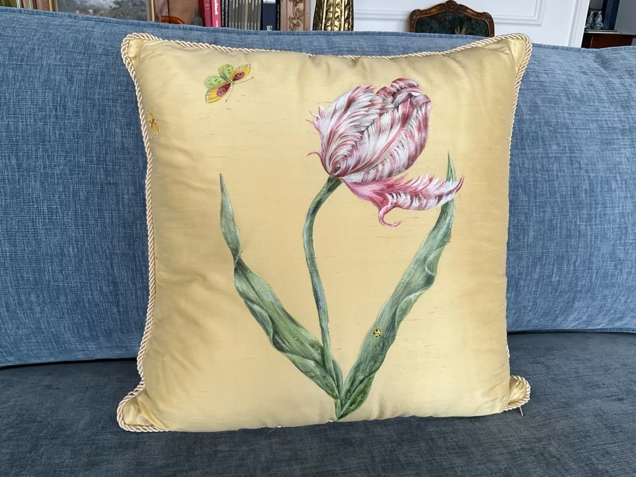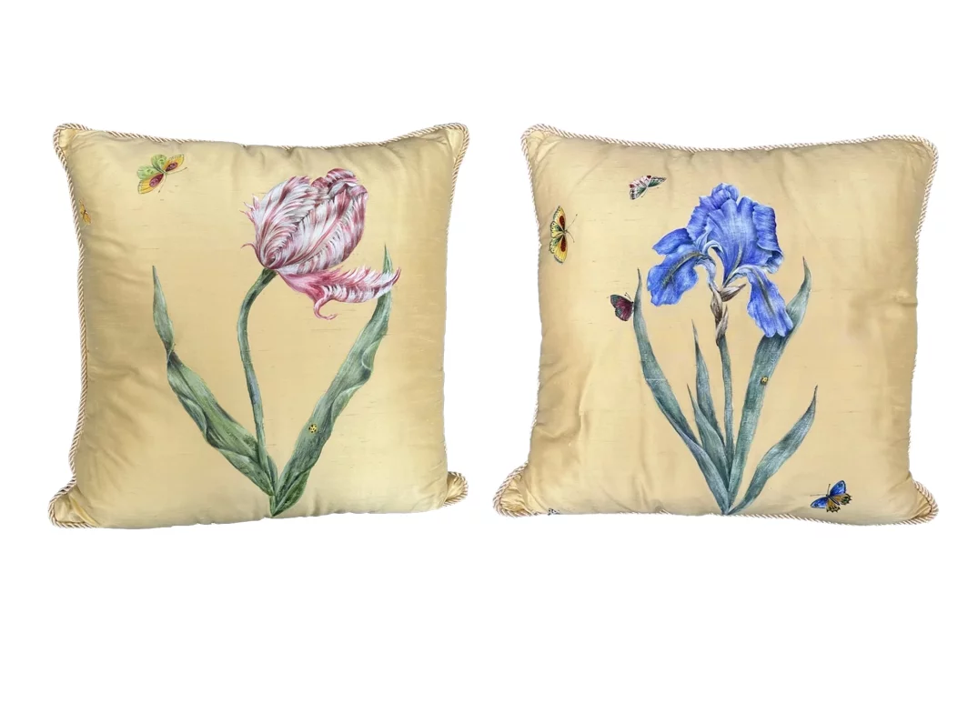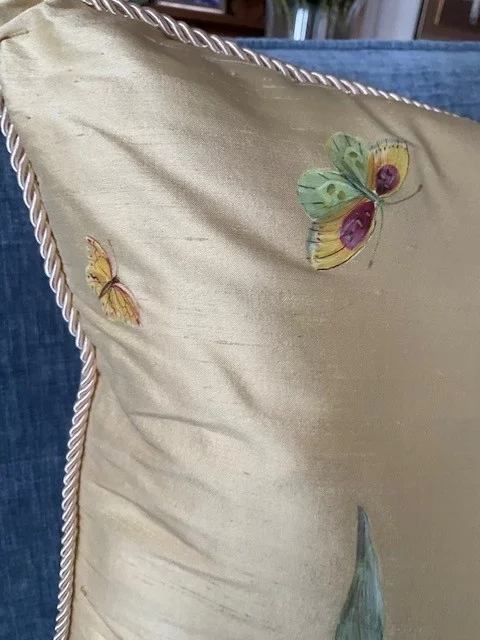 Pre-owned & Refurbished CUSTOM MADE - A Pair of Hand painted Nardi Ablett Pale Lemon Silk Cushions | Collecte