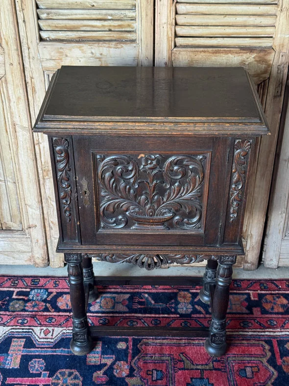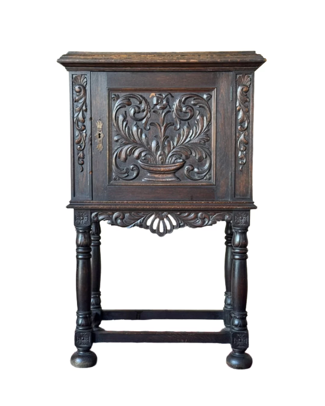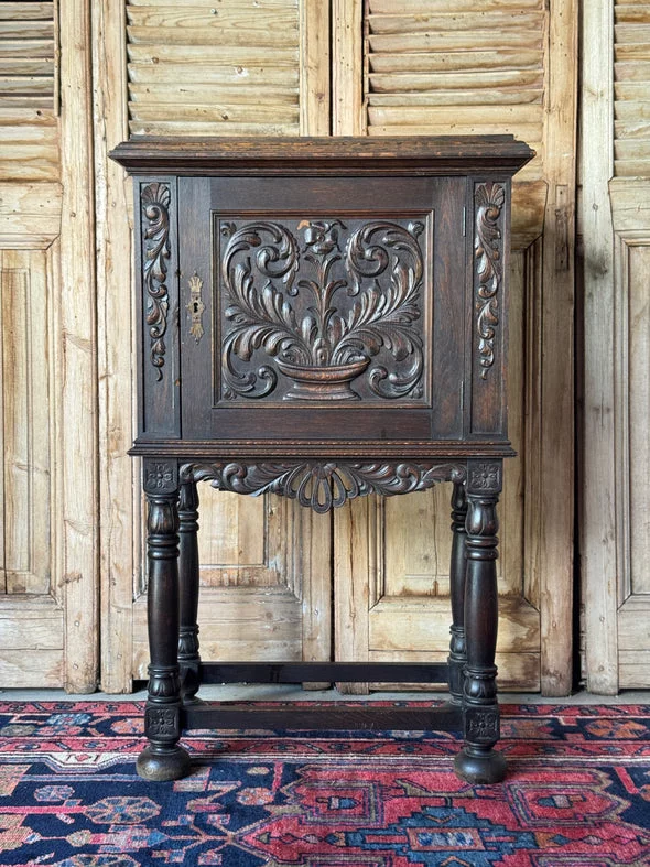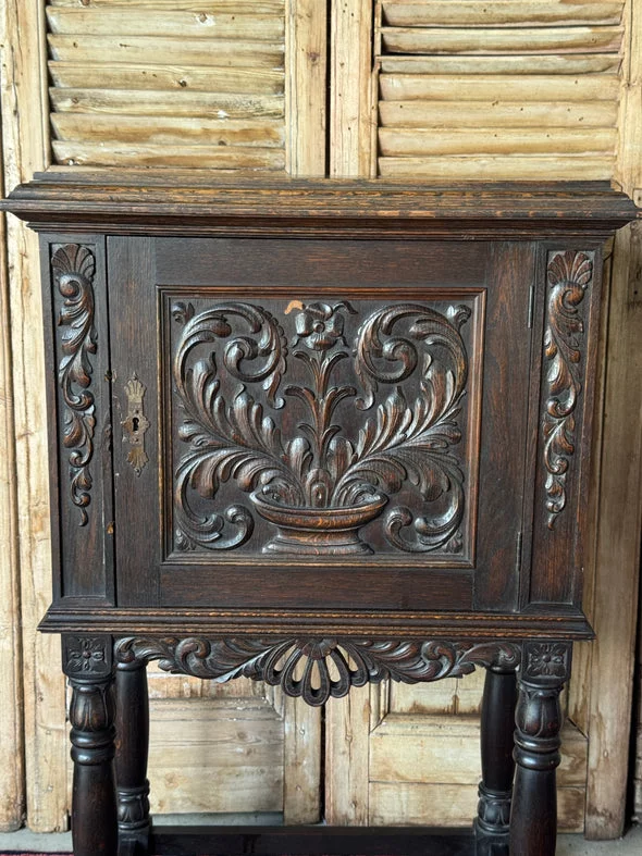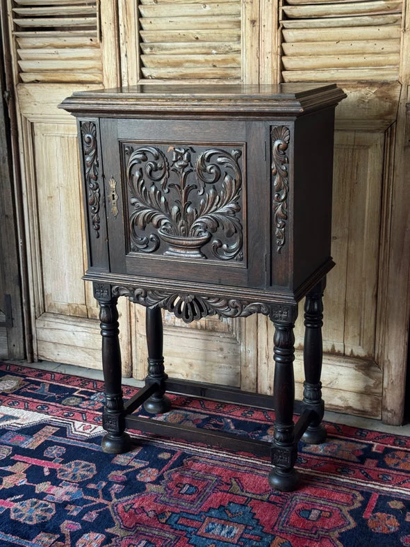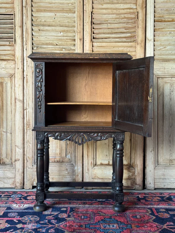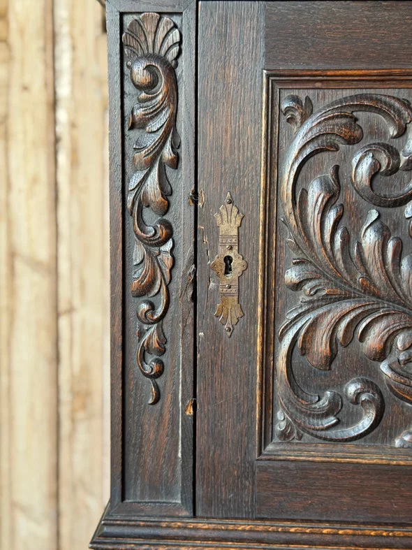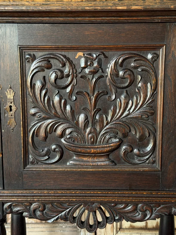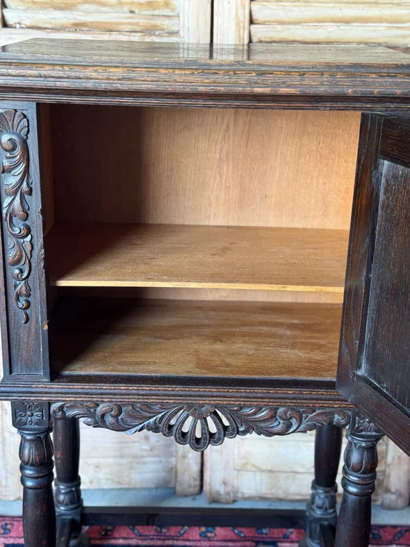 Pre-owned & Refurbished ANTIQUE - Danish Carved Oak Upright Side Cabinet on Turned Legs | Collecte
