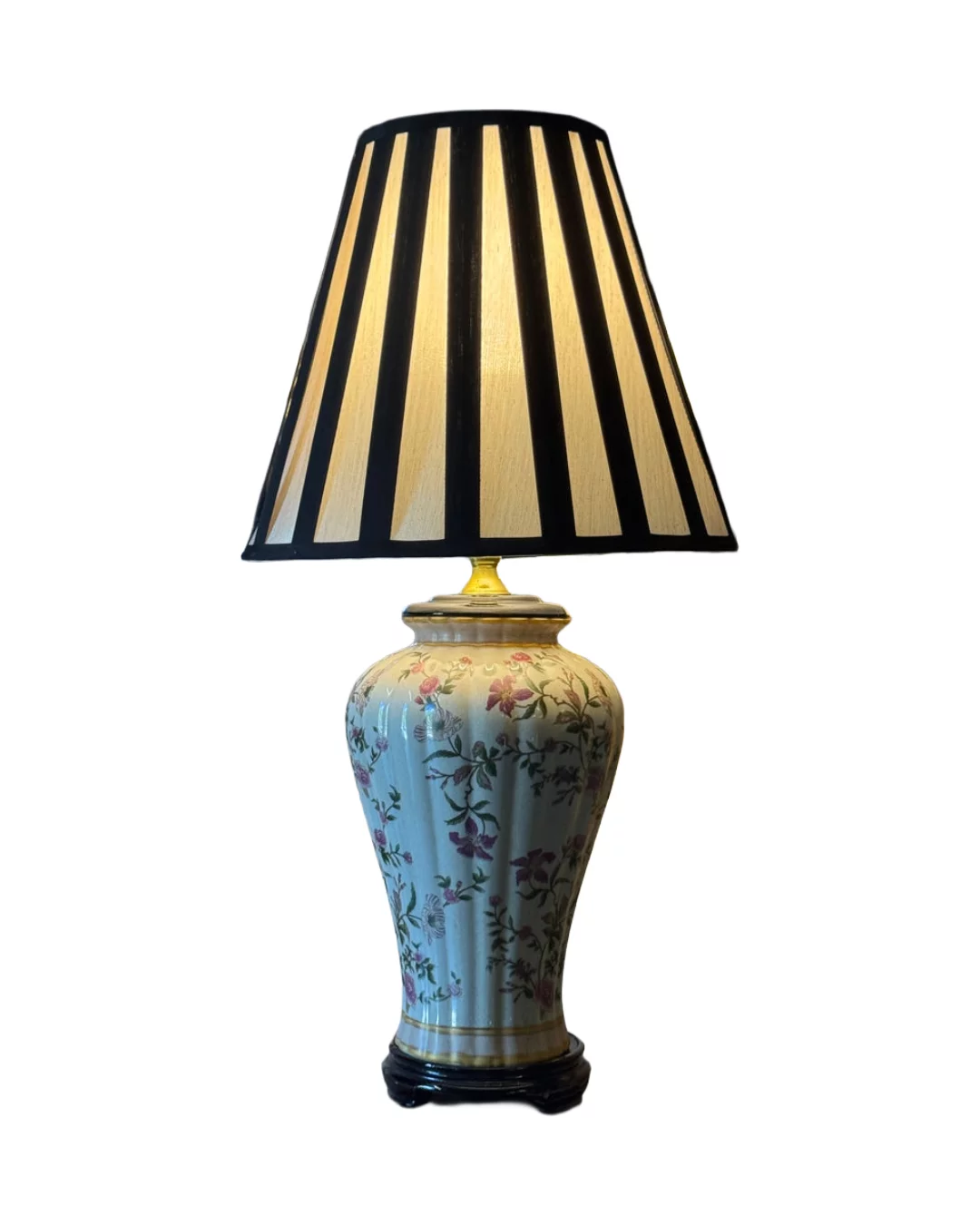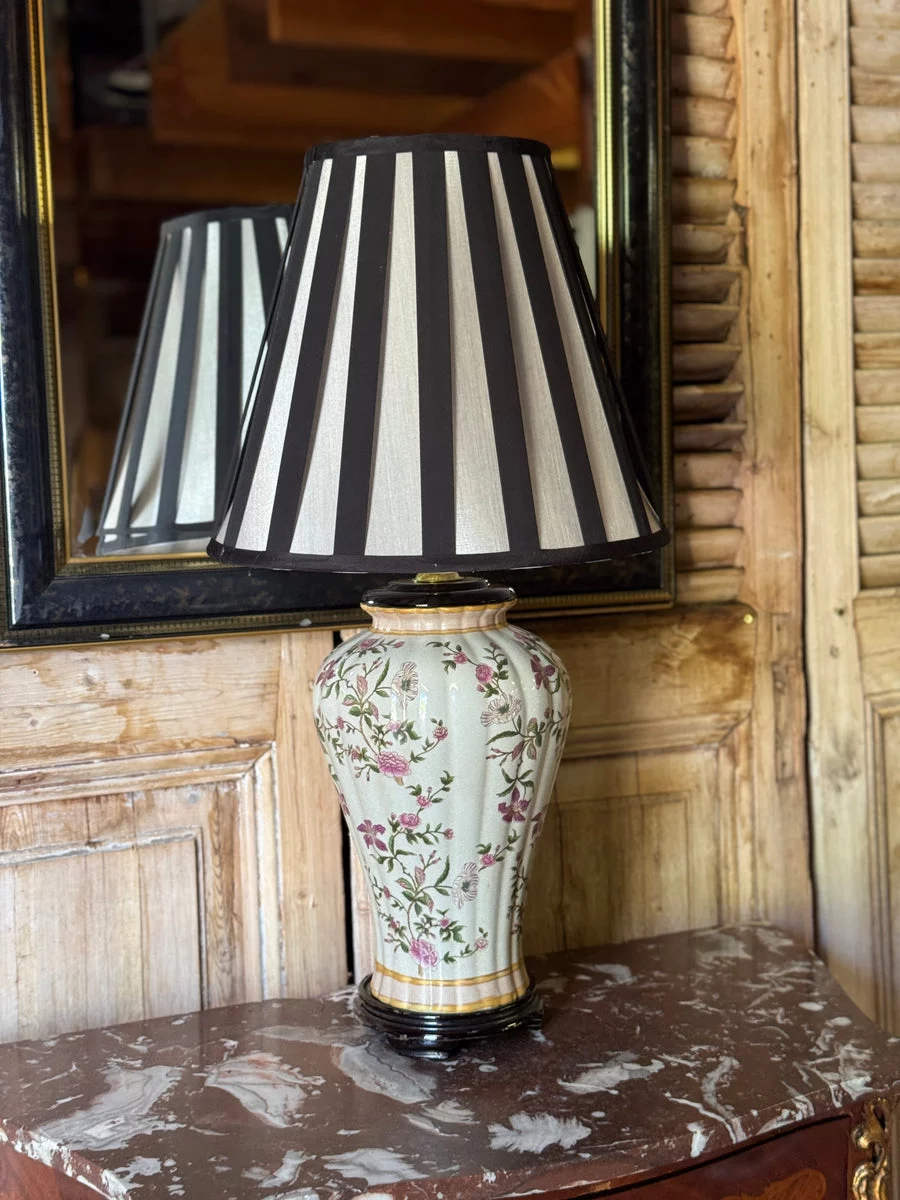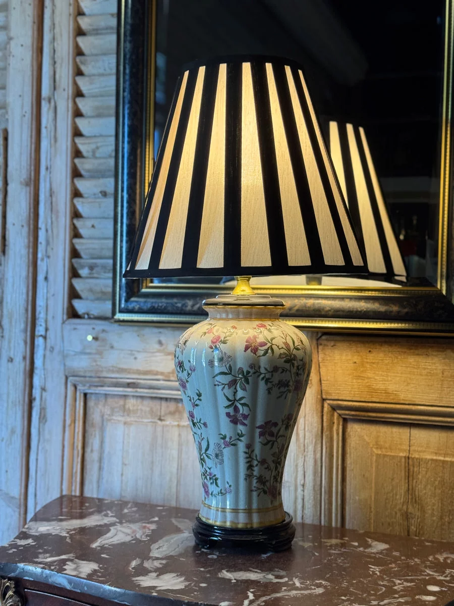 Pre-owned & Refurbished VINTAGE - Floral Ceramic Table Lamp with Black and White Striped Shade | Collecte