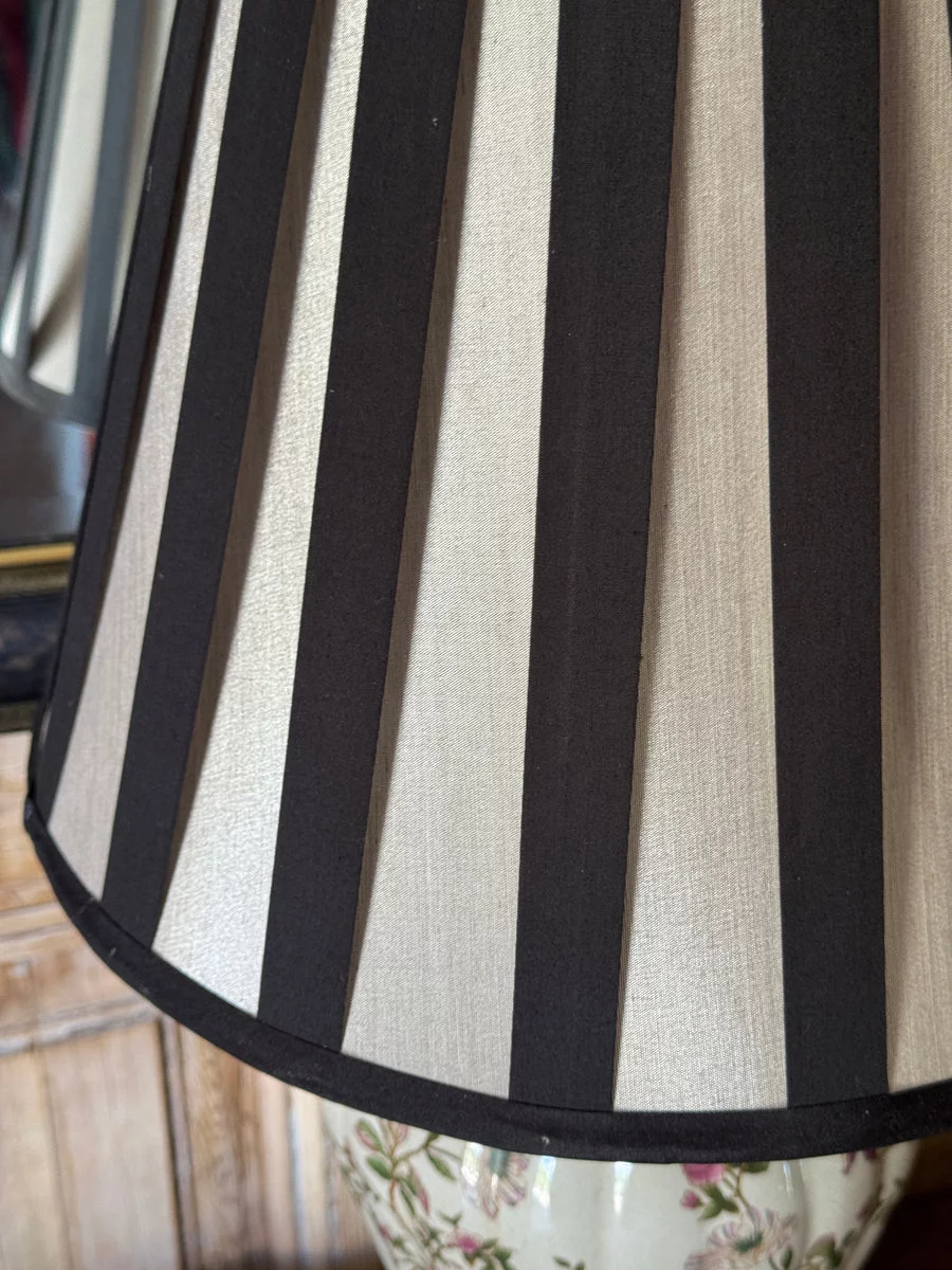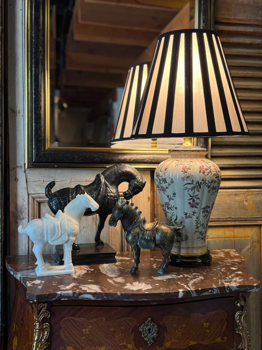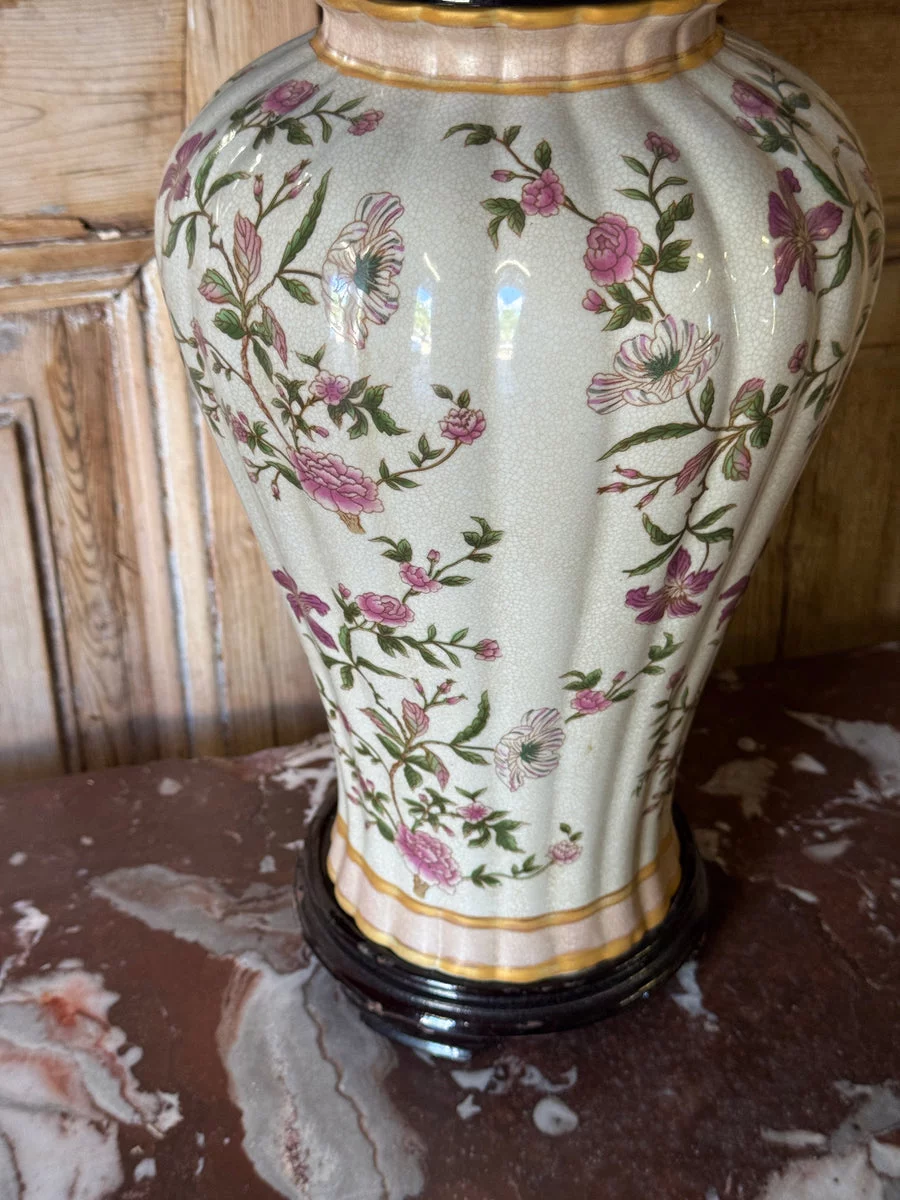 Pre-owned & Refurbished VINTAGE - Floral Ceramic Table Lamp with Black and White Striped Shade | Collecte
