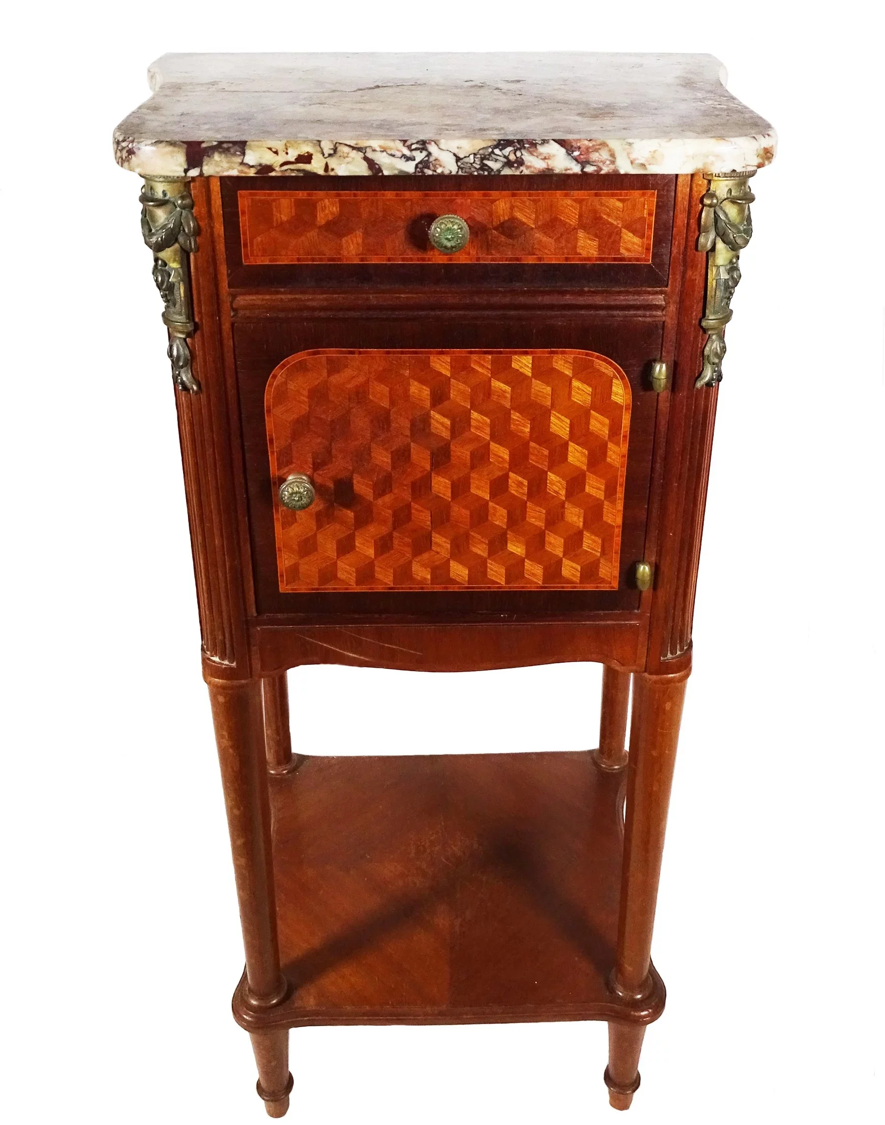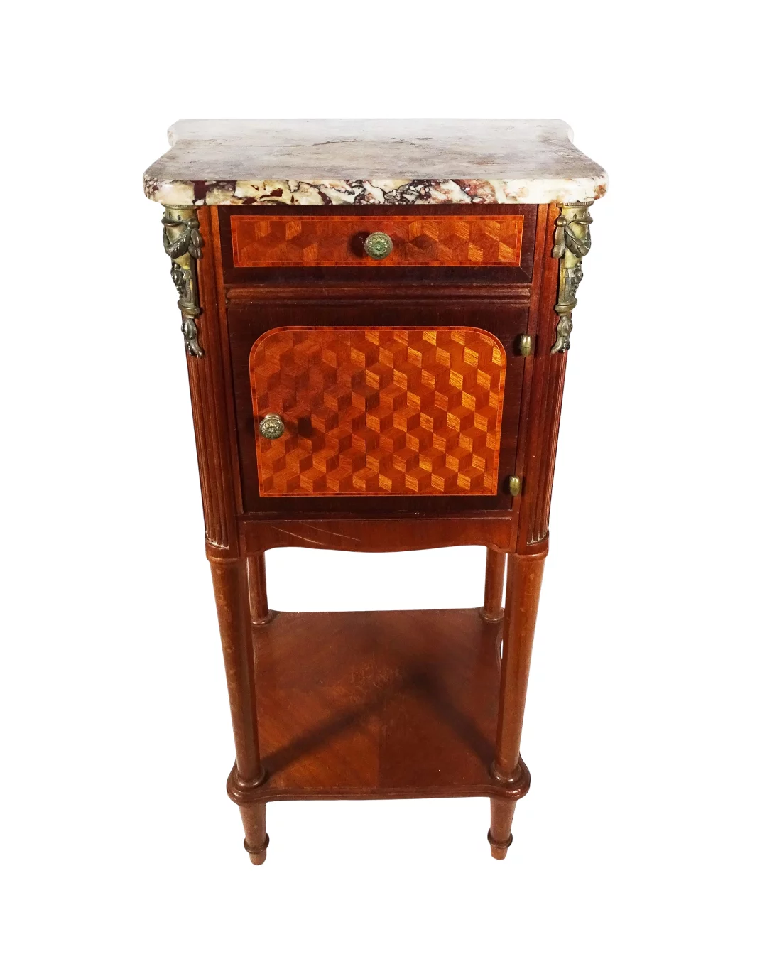 Pre-owned & Refurbished ANTIQUE - French Marquetry Inlaid and Marble Top Bed Side Cabinet | Collecte