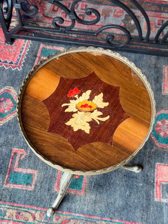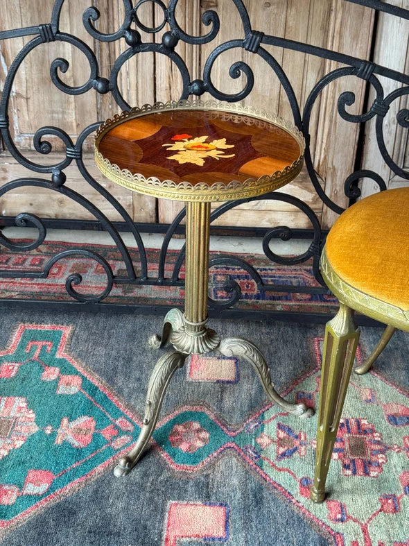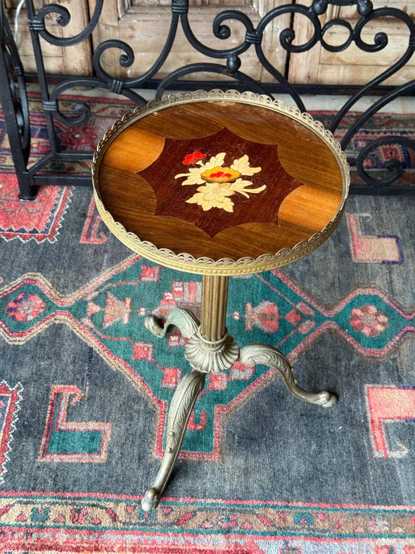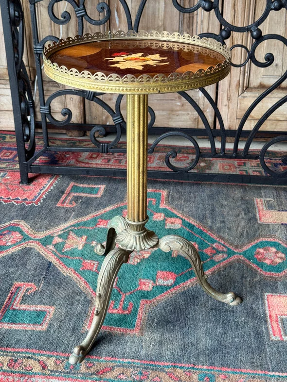 Pre-owned & Refurbished VINTAGE - French Marquetry Side Table on Brass Tripod Base | Collecte