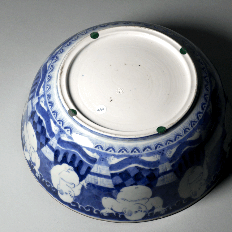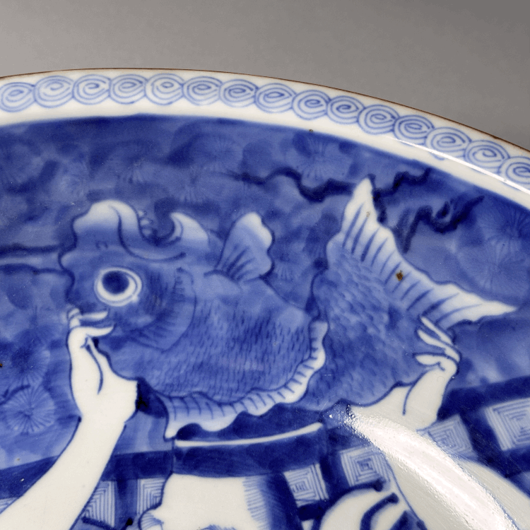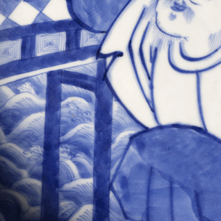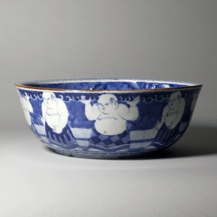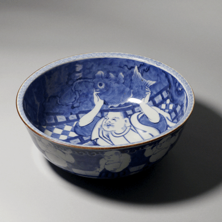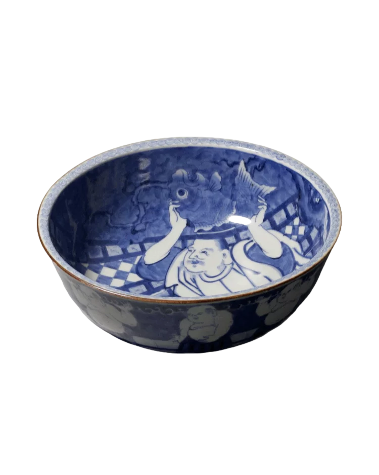 Pre-owned & Refurbished ANTIQUE - Large Blue and White Bowl with Ebisu and Sumo Wrestler Design | Collecte