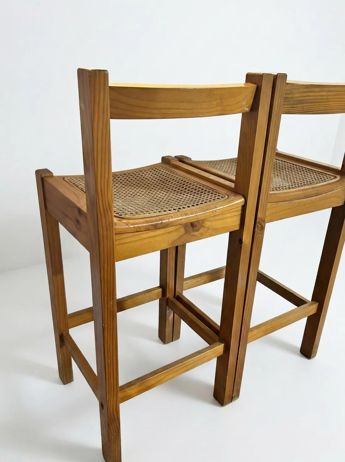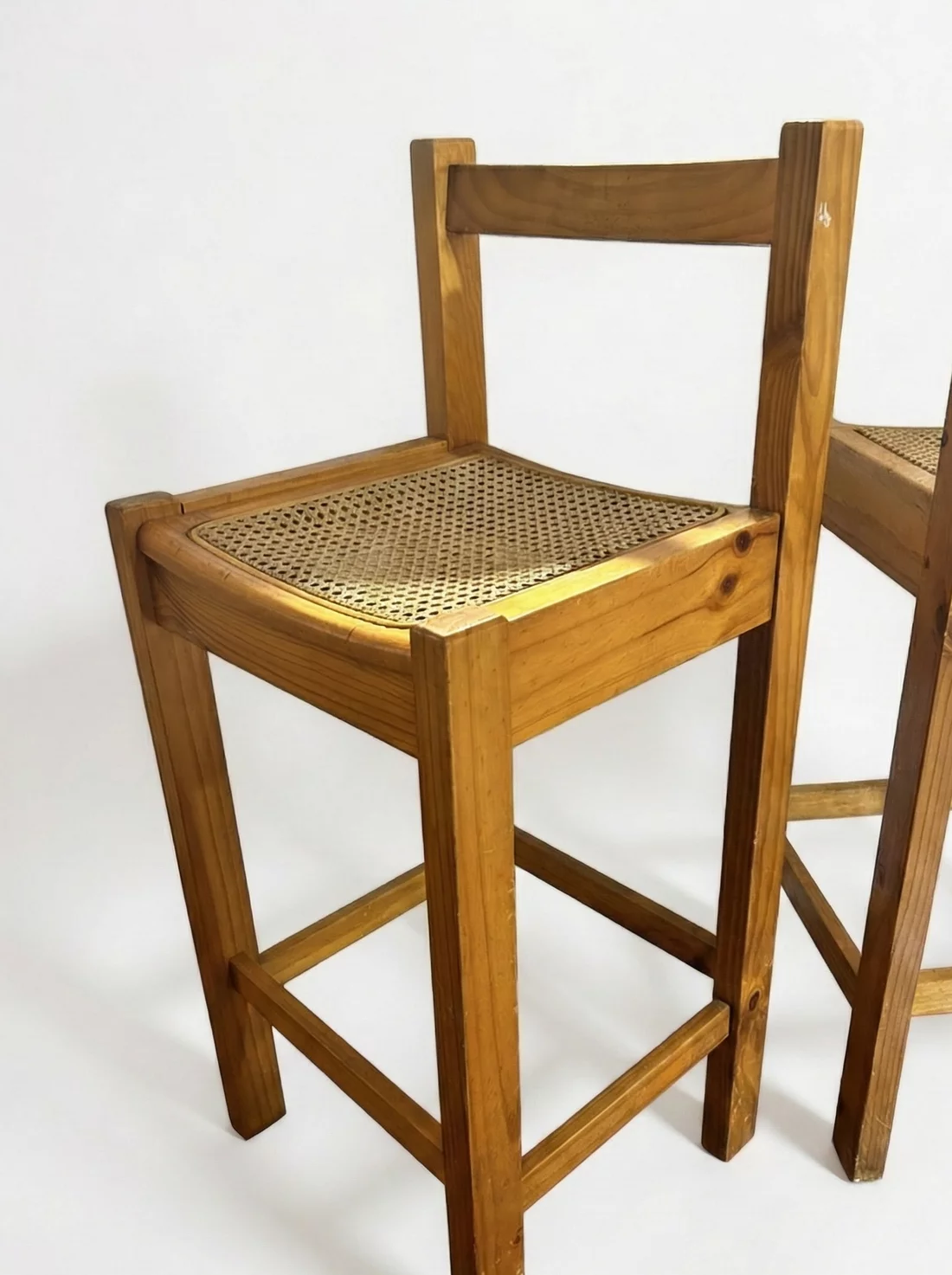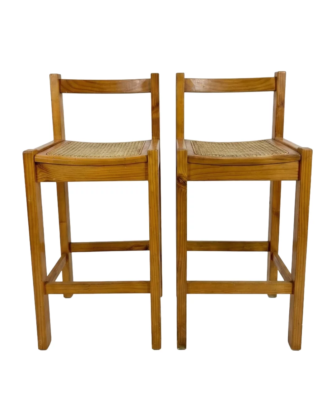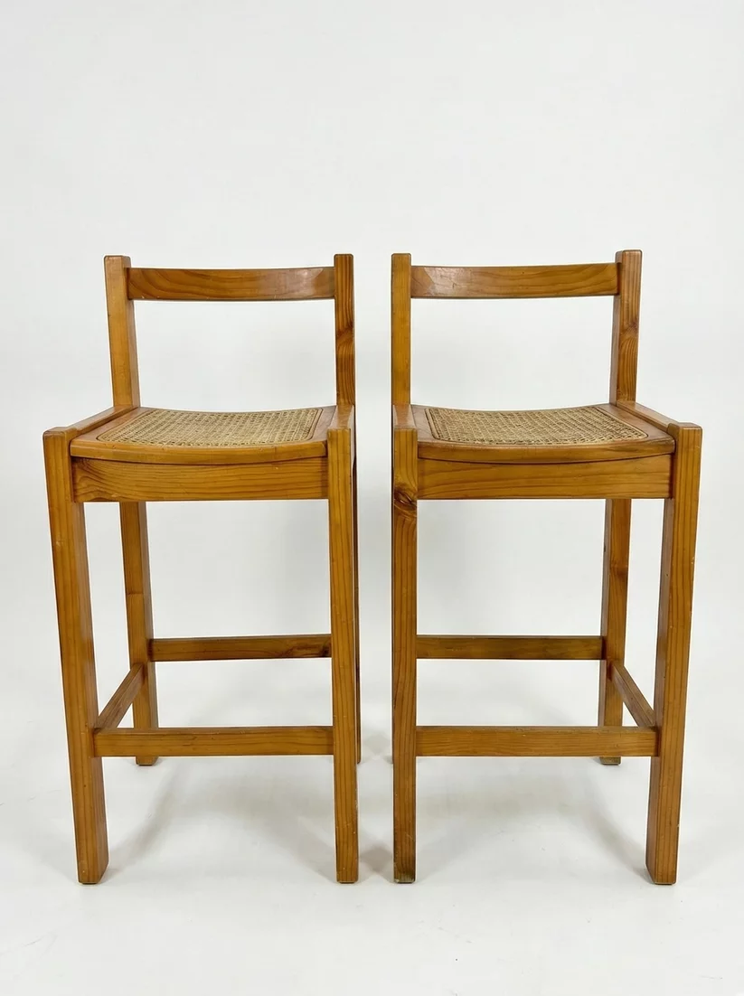 Pre-owned & Refurbished VINTAGE - Pair of 1980s Pine and Woven Cane Bar Stools | Collecte