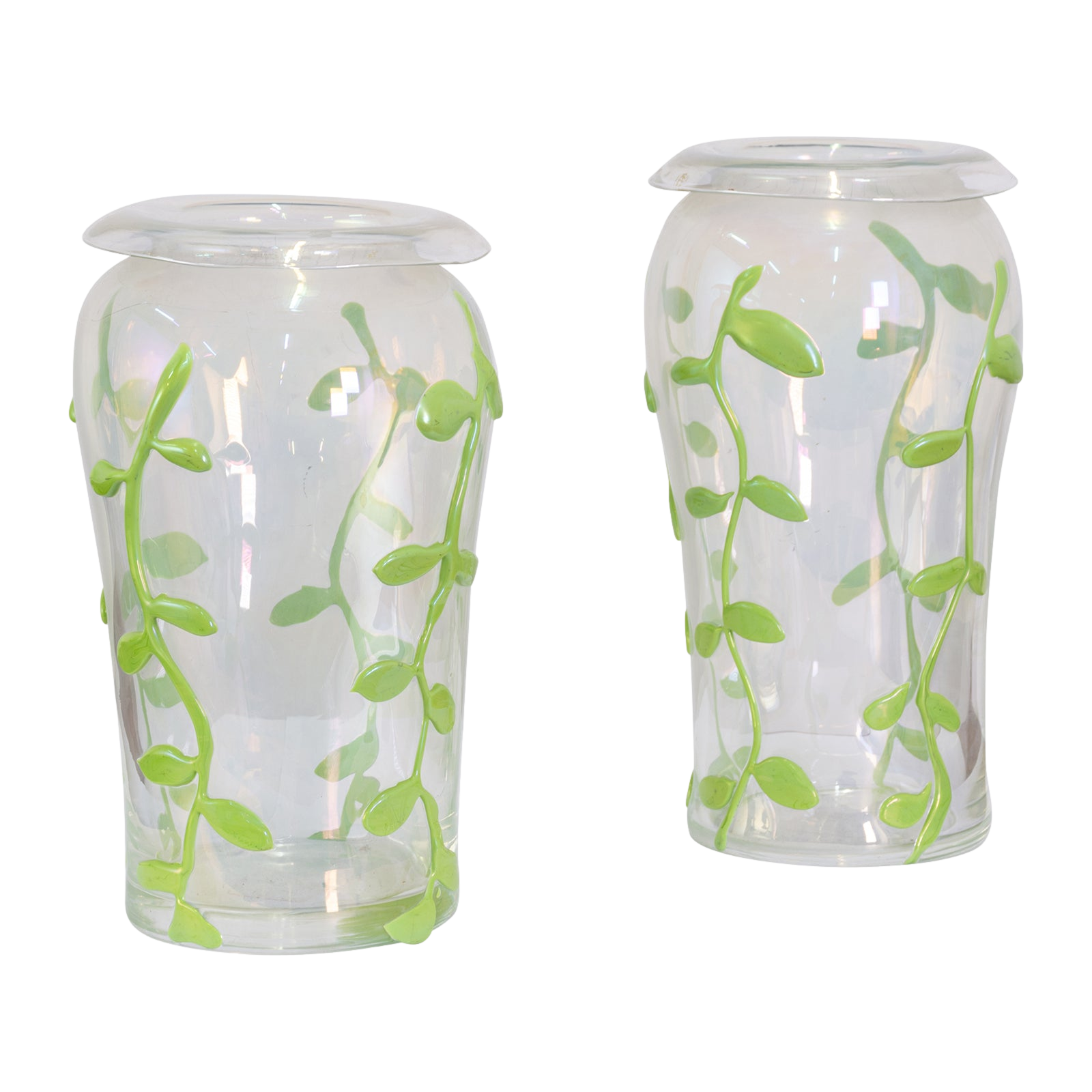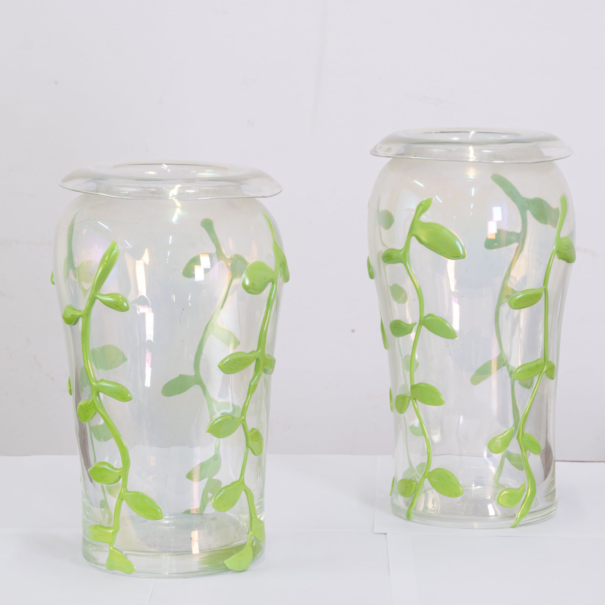 Pre-owned & Refurbished MID CENTURY - Pair of Iridescent Murano Vases with Applied Green Leaves | Collecte