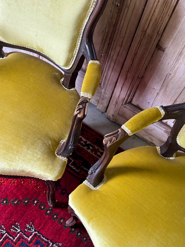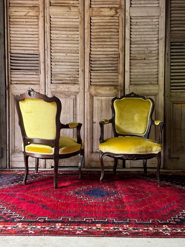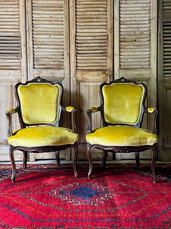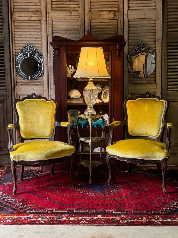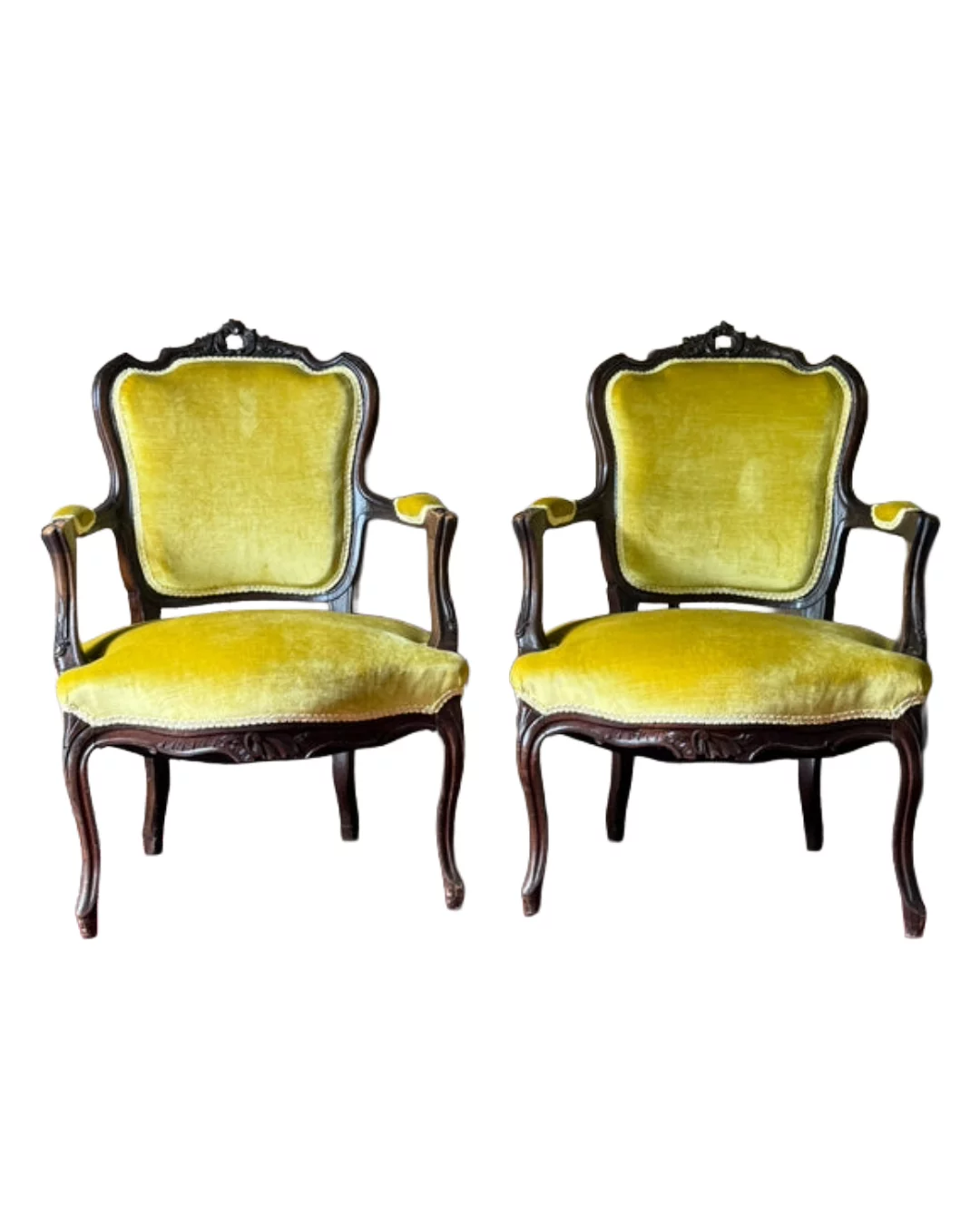 Pre-owned & Refurbished VINTAGE - Pair Of French Salon Chairs With Chartreuse Velvet Upholstery | Collecte