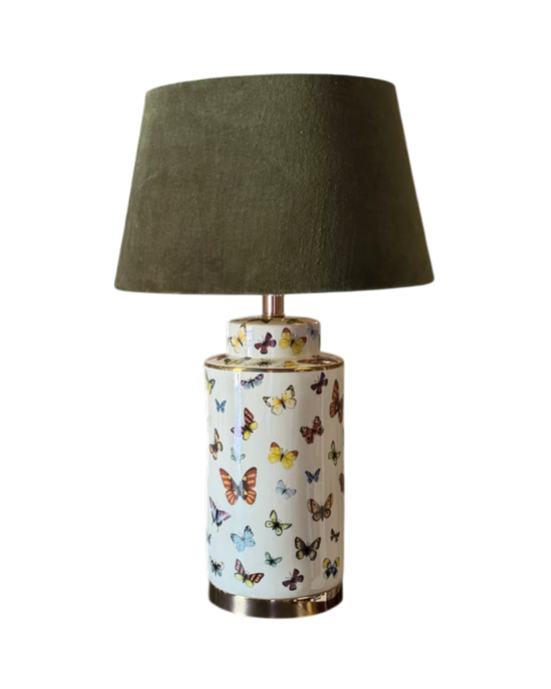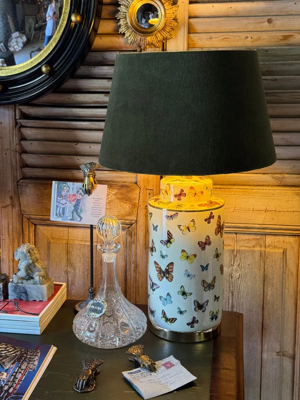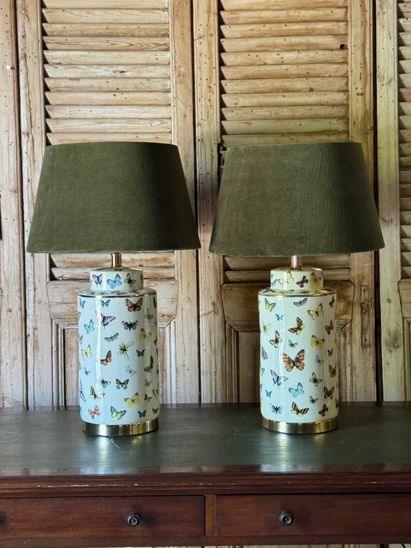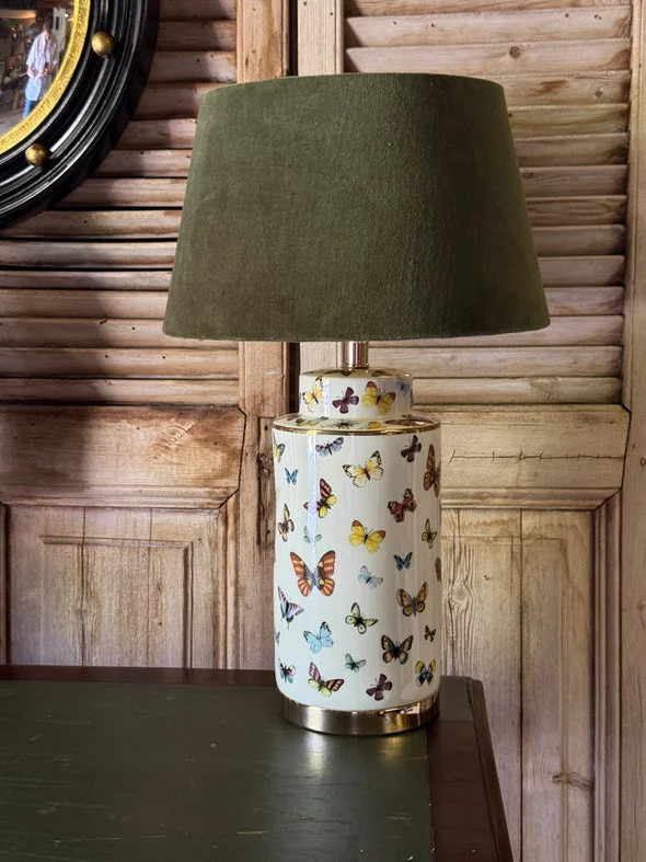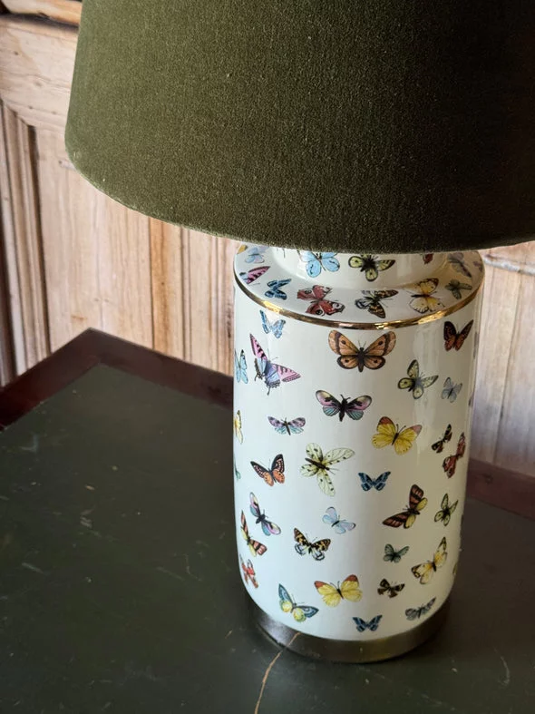 Pre-owned & Refurbished Contemporary - White Ceramic Butterfly Table Lamp with Olive Velvet Drum Shade | Collecte